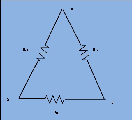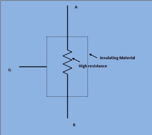The resistance R is between main terminals A and B and the leakage resistances Rag and Rbg between the main terminals A and B of form a "Three terminal resistance". Let us consider the hypothetically case of a 100 MΩ resistance. We assume that each of the leakage resistances is also the same values. Measured by ordinary wheatstone bridge method, we get the value of 67MΩ and the giving error of 33% of original value.