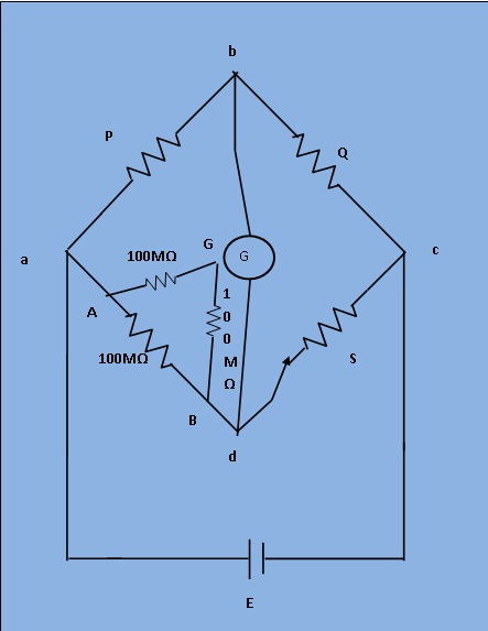 However, if the same resistance is measured by a modified wheatstone bridge as shown in Figure 3 the error in measuremnt is considerably reduced. For the arrangement shown in Figure 4 resistance Rbg is put in parallel with the galvanometer and thus it has no effect on the balance and only effects the sensitivity of the galvanometer slightly. Sensitivity for balancing against high resistance is obtained by use of adjustable high voltage supplies of 500V or 1000V and the use of a sensitive null indicating arrangement. The dial on Q is calibrated 1-10-100-1000M, with main decade 1-10 occupying greater part of the dial space. Since unknown resistance R=PS/Q ,the arm Q is made tapered, so that the dial calibration is approximately logarithmic in the main decade, 1-10. Arm S gives five multipliers, 0.1,1,10,100 and 1000.